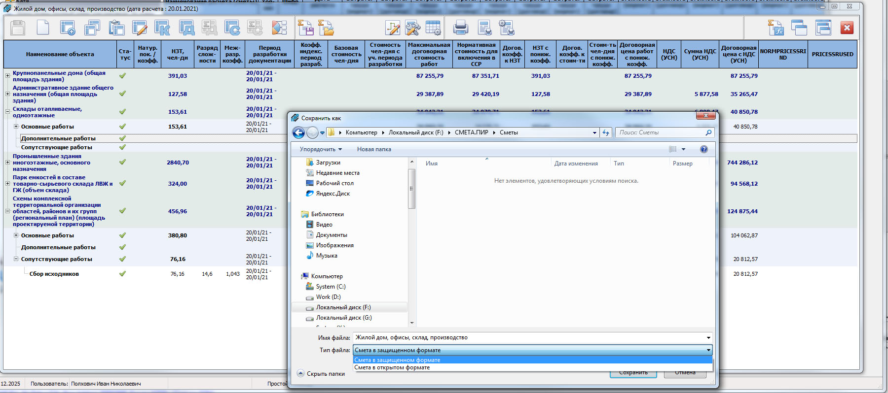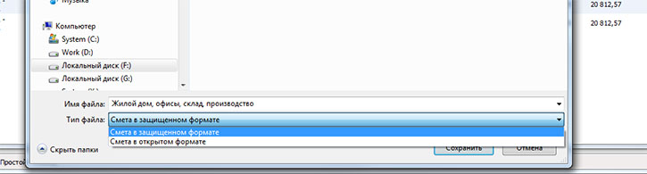 Для возможности передачи другим пользователям сметной документации, сформированной с использованием информационной системы, в клиентском приложении предусмотрена возможность сохранения произведенных расчетов в файлы специального формата. Программное обеспечение системы позволяет формировать файлы двух типов: смета в открытом формате <имя_файла>.spo и смета в защищенном формате <имя_файла>.spc (рисунок 1.7).