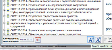В различных окнах программного обеспечения системы, содержащих различные виды текстовой и табличной информацию (списки, деревья, таблицы данных) предусмотрена возможность изменения размера шрифта текста, содержащегося в данных элементах. Для этого, как правило в районе нижнего правого угла соответствующего элемента располагаются две кнопки с изображением буквы «А» со стрелками, направленными вверх и вниз (рисунок 1.10), с помощью которых производится соответственно увеличение или уменьшение размера текста. При наведении указателя мыши на одну из них отображается всплывающая подсказка, в которой содержится текущий размер.