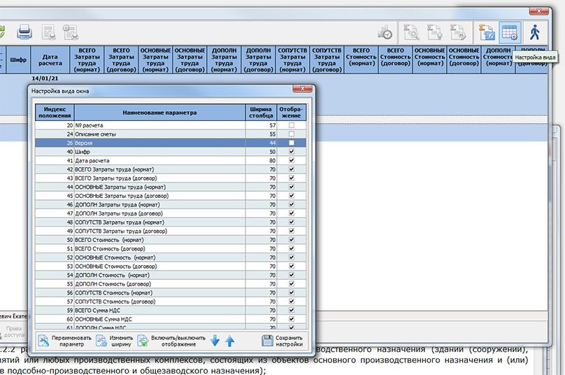 В таблицах некоторых окон клиентского приложения доступно для отображения достаточно большое количество различных параметров, которые, как правило, не помещаются в видимой области экрана и вызывают появление полос прокрутки. Для оптимизации размещения информации в пределах видимой области экрана реализована система настройки вида различных таблиц с данными. Пользователем, в зависимости от его потребностей в конкретной ситуации из всех доступных для отображения параметров могут быть выбраны только те, которые ему необходимы. При этом, имеется возможность изменения порядка следования столбцов в таблице данных и изменения ширины колонок. Окно настройки параметров вида таблиц представлено на рисунке 1.11 и вызывается кнопкой «Настройка вида», размещенной на панели инструментов соответствующего окна.